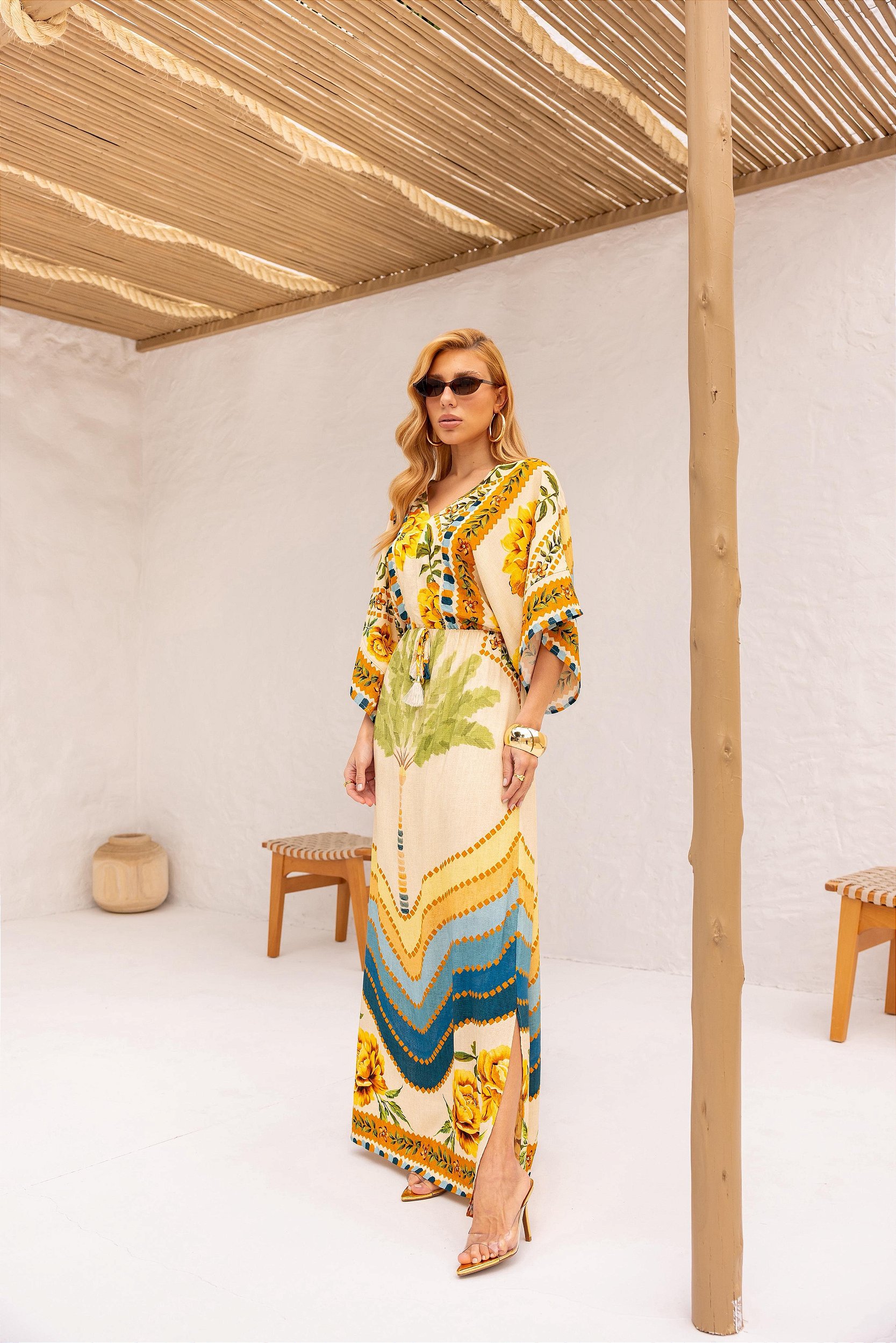 Com design leve e sofisticado, este vestido longo em viscose é a escolha perfeita para os dias ensolarados. A estampa tropical com folhagens e flores vibrantes em tons de amarelo, verde e azul transmite frescor e elegância. Possui modelagem fluida com caimento impecável, mangas amplas estilo kimono e detalhe ajustável na cintura com amarração, valorizando a silhueta de forma confortável. O tecido 100% viscose garante toque macio, frescor e movimento ao caminhar. Destaque para a fenda lateral discreta, que acrescenta um charme extra ao look.